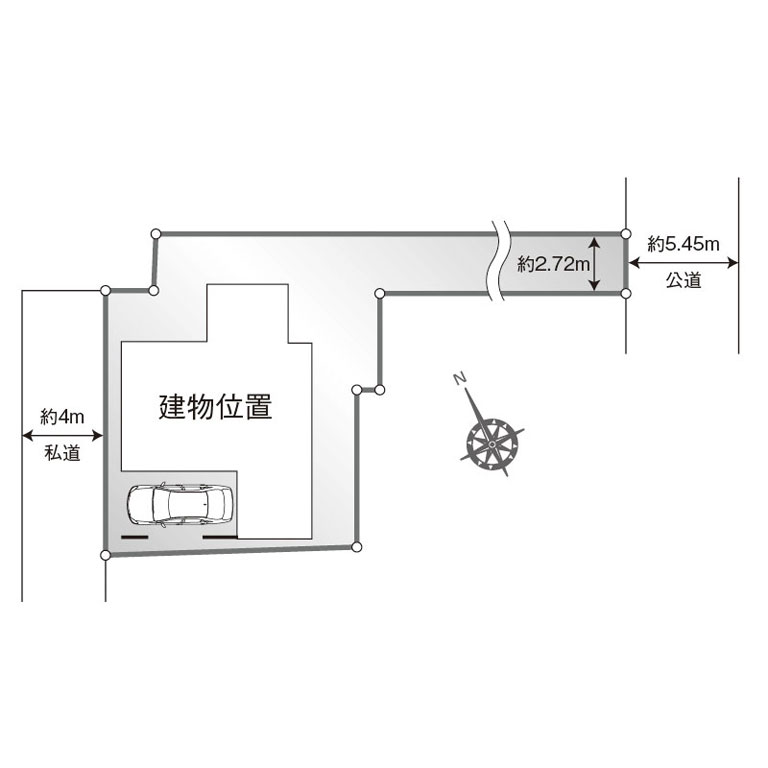 | 接道 | 東南側約5.45m公道・北西側約4m私道(SB後) |